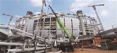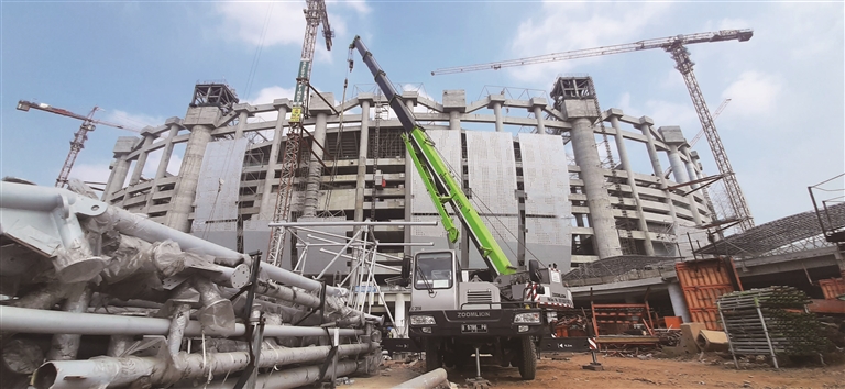 近日,在印度尼西亚雅加达国际体育场工地上,数十台中联重科起重机设备正在奋力工作,包含履带吊、汽车吊、越野轮胎吊和塔机在内的“小绿军团”不舍昼夜,全力支持场馆建设。施工期间,“小绿军团”力担重任,助力雅加达国际体育场创下一项世界级施工纪录:吊装的主桁架总重3900吨、长度70米,为全球体育场屋顶上进行的最大、最重的吊装工程。