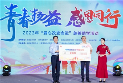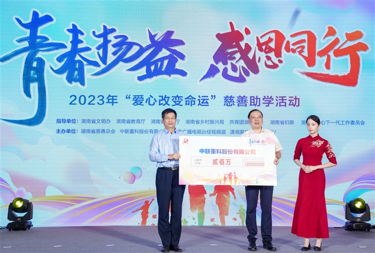 在第八个“中华慈善日”来临之际,8月31日,湖南省民政厅联合省文明办、省教育厅、省乡村振兴局、共青团省委、省妇联、省关工委、省慈善总会、中联重科、湖南经视、潇湘晨报、芒果TV在长沙市举行“青春扬益 感恩同行”2023年爱心改变命运慈善助学活动。湖南省政协原主席、省慈善总会总顾问王克英,湖南省相关厅(局)及市州民政局有关领导,中联重科党委副书记兼纪委书记王旭虹等出席活动。省民政厅党组书记、厅长曹忠平在活动上致辞。在此次慈善助学活动现场,中联重科捐赠慈善款200万元。